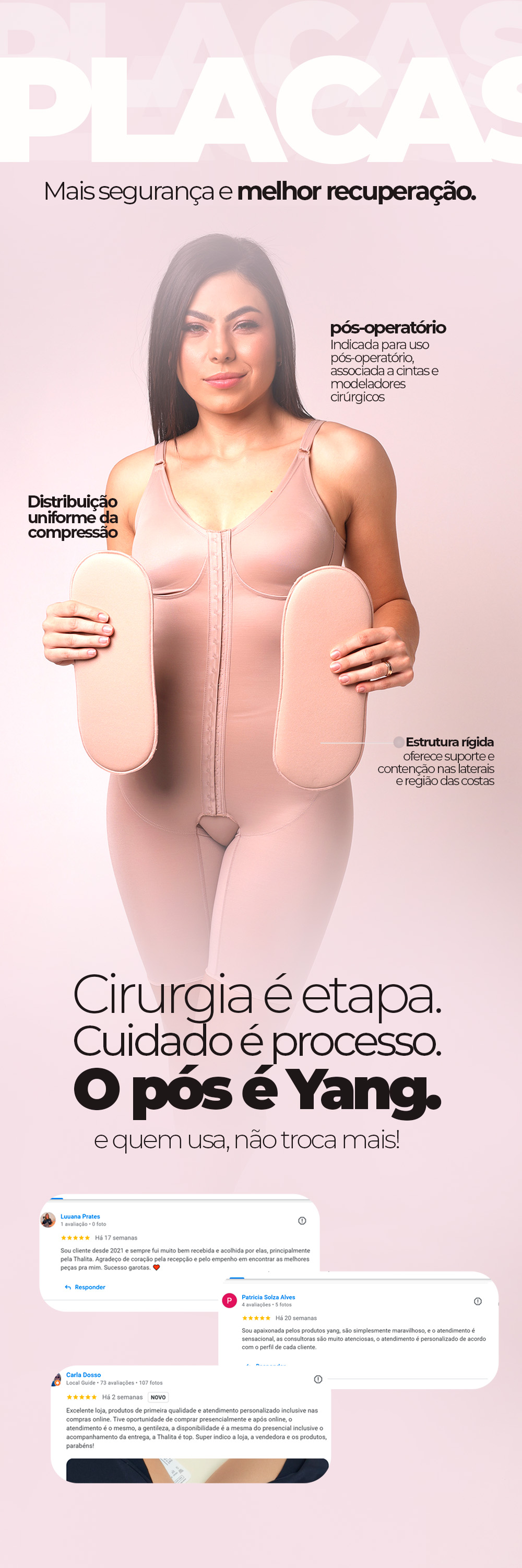 Placa rígida indicada para contenção lateral e região das costas no pós-operatório, auxiliando na compressão uniforme, melhor acomodação dos tecidos e mais segurança durante a recuperação.